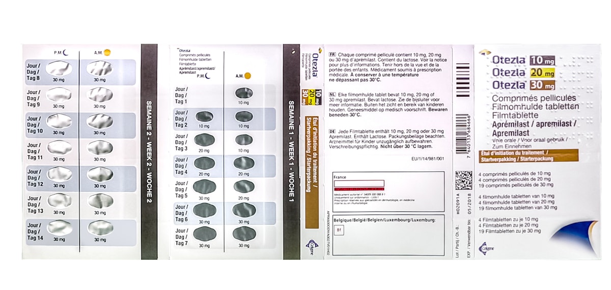 Otezla apremilast titration pack - AUST R 220424. Otezla apremilast 30 mg tablet blister pack - AUST R 220423. Published by MIMS March.